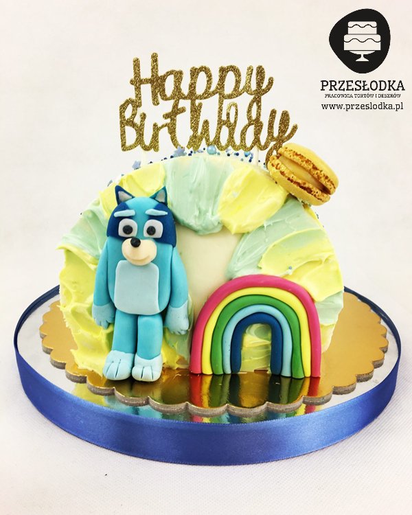 Tort z pieskiem Bluey z australijskiego serialu o rodzinie psów. Zamów podobny tort lub według swojego projektu. Figurka psa Bluey z masy cukrowej wraz z tęczą, makaronikami i topperem urodzinowym. Figurka w całości jadalna, ręcznie robiona. Tort w niecodziennym kształcie – tzw. przewrócony tort. Torty Piaseczno, Warszawa.