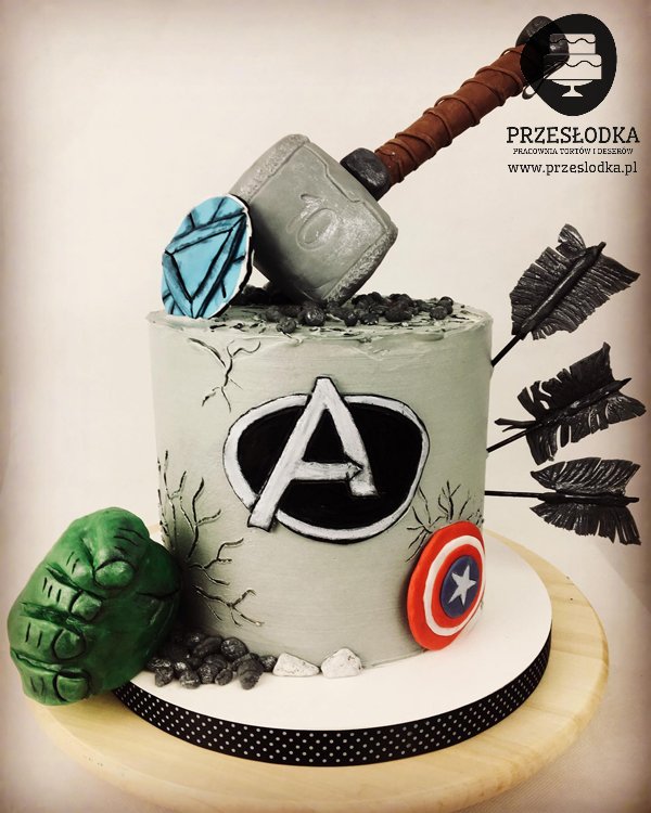 Tort ozdobiony jest ręcznie robionymi figurkami z masy cukrowej - młotem Thora, tarczą Kapitana Ameryki, pięścią Hulka, logiem Iron Mana i strzałami Hawkeya. Torty Piaseczno, Warszawa.