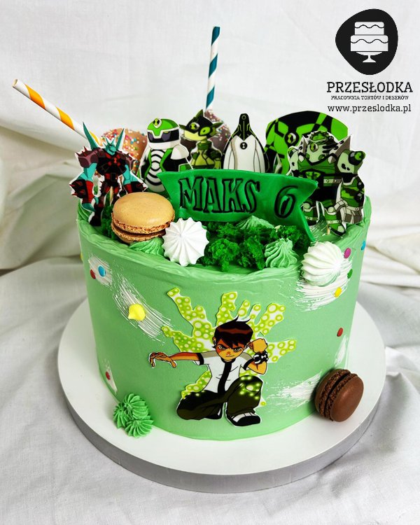 Zielony tort z motywami z serialu Ben Ten. Figurki bohaterów na wydrukach na jadalnej masie cukrowej z makaronikami, bezikami własnego wypieku. Torty Piaseczno, Warszawa.