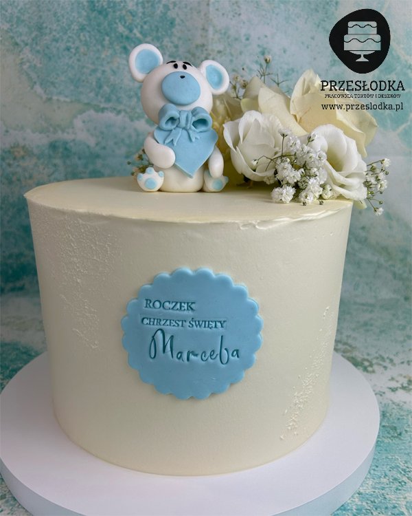 Uroczy tort z biało niebieskim misiem. Figurka małego misia w śliniaczku - tort na roczek, a zarazem chrzest dziecka. Tort ozdobiony kwiatami naturalnymi. Torty Piaseczno, Warszawa.