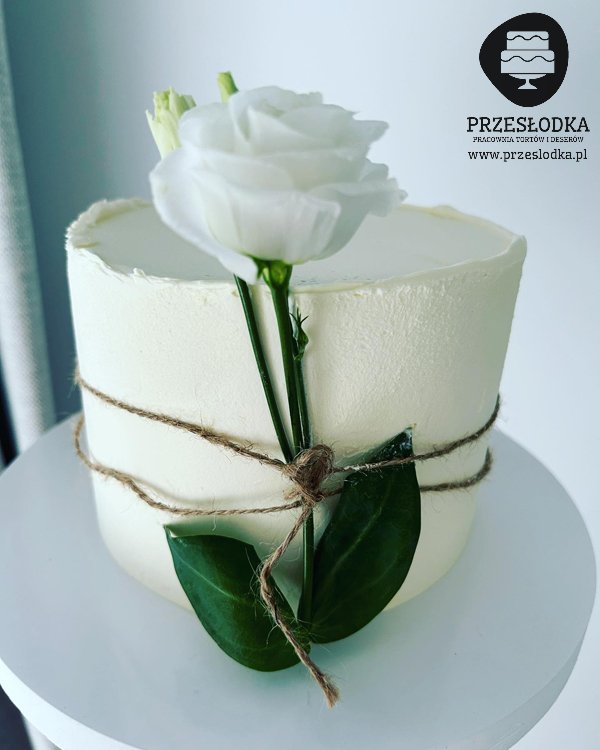 Tort dla kobiety na urodziny lub całkowicie bez okazji. Biała róża przyczepiona sznurkiem do tortu nadaje elegancji i gracji. Torty Piaseczno, Warszawa.