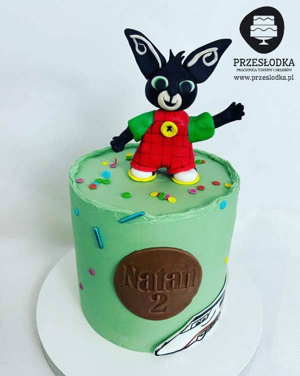 Dziecięcy tort z motywem z serialu Bing. Na torcie jadalna figurka Binga. Bing to króliczek, który ma trzy latka i bardzo lubi uczyć się nowych rzeczy. Ma czarne futerko, duże zielone oczy i fantastyczne olbrzymie uszy. Ubrany jest w zieloną koszulkę i czerwone ogrodniczki w czarną kratę z dużym żółtym guzikiem na środku. Torty Piaseczno, Warszawa.