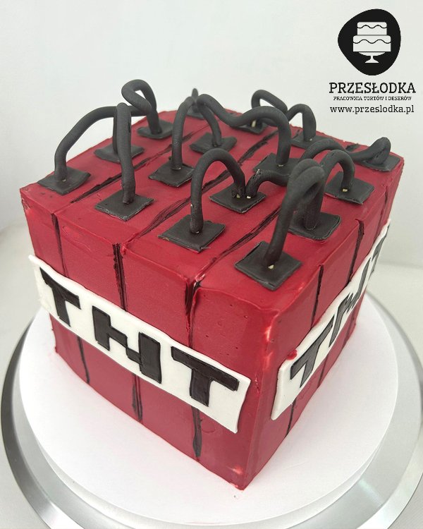 Tort okolicznościowy kwadratowy - bomba TNT z Minecrafta. Tort w całości jadalny. Ozdoby z masy cukrowej. Na tabliczce oprócz napisu TNT może być imię i wiek jubilata. Torty Piaseczno, Warszawa.