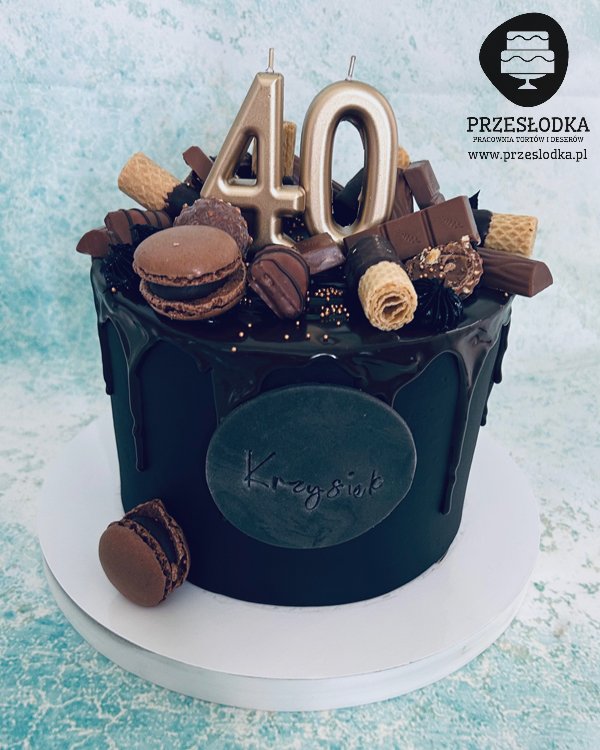 Tort czarny męski na czterdzieste urodziny dla mężczyzny ozdobiony słodkościami. Torty Piaseczno, Warszawa.