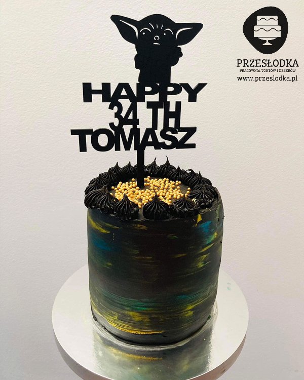Idealny tort urodzinowy z motywem z Gwiezdnych Wojen. Na topperze Mistrz Yoda. Minimalistyczny tort dla mężczyzny na urodziny. Torty Piaseczno, Warszawa.