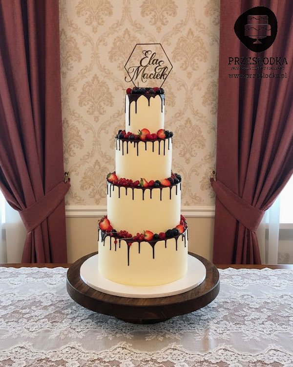 Tort czteropiętrowy na wesele dla pary młodej i ich gości. Tort ozdobiony czekoladą i owocami - torty Piaseczno, Warszawa.