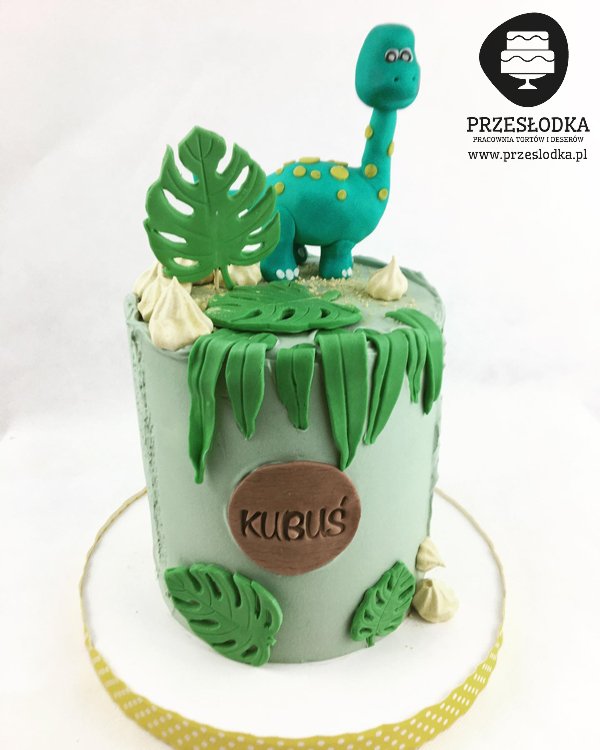 Jadalna figurka bajkowego dinozaura na torcie. Tort zielony dinozaur, idealny dla dziecka, które fascynuje się światem dinozaurów. Torty Piaseczno, Warszawa.