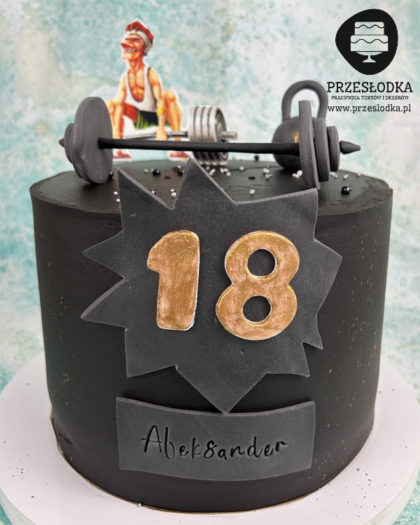 Tort w kolorze czarnym dla mężczyzny. Na torcie ręcznie robione figurki sztangi i ciężarka oraz wydruk jadalny. Torty Piaseczno, Warszawa.