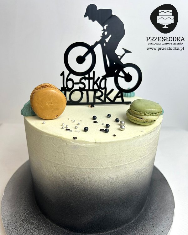 Tort dla sportowca - rowerzysty, który uwielbia robić tricki na swoim BMXie. Biało czarny tort z dedykowanym topperem i słodkimi makaronikami. Torty Piaseczno, Warszawa.