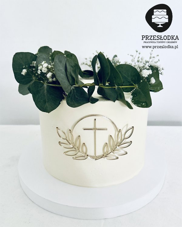 Tort komunijny przyozdobiony liśćmi eukaliptusa.