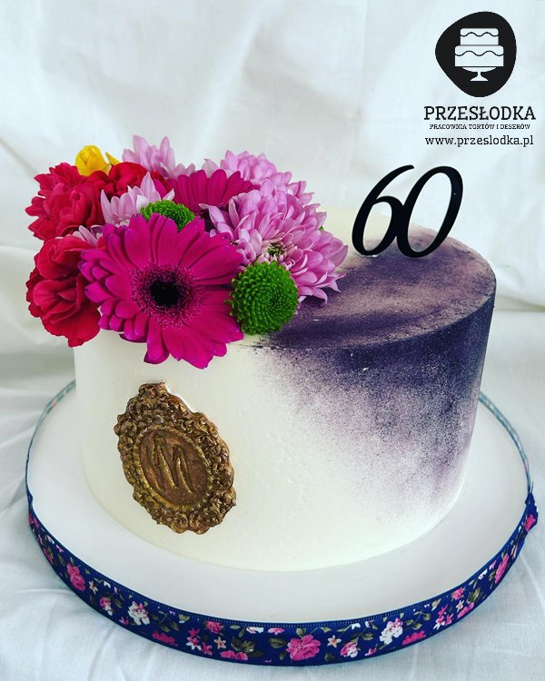 Tort dla kobiety, pięknie ozdobiony kwiatami naturalnymi na urodziny. Charakterystyczne fioletowe zdobienie na bocznej części tortu.