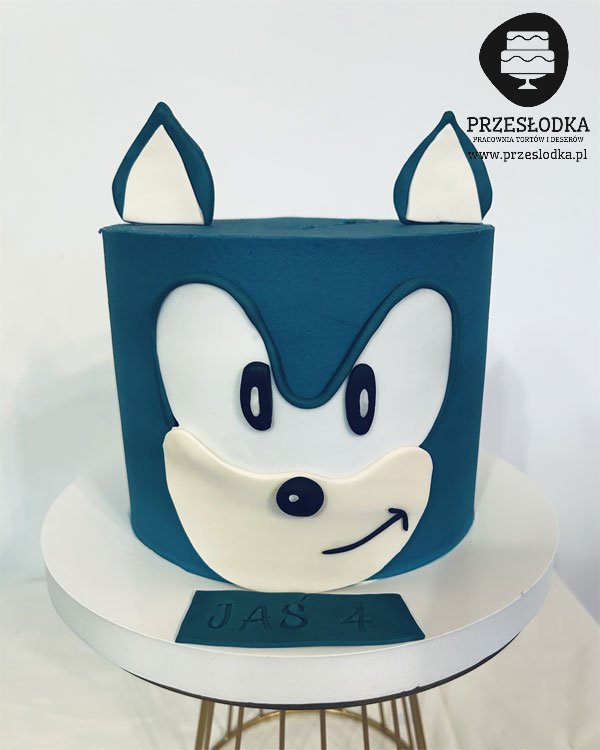 Tort w kształcie głowy superszybkiego jeża - Sonica. Bohatera gier dla dzieci - torty Piaseczno, Warszawa.