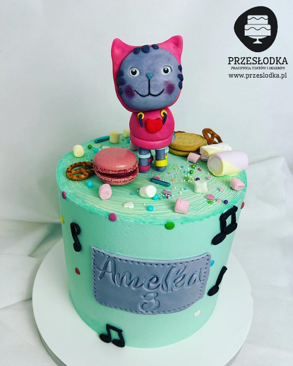 Tort dla młodej fanki bajki Koci Domek Gabi z figurką DJ Kocimiętki. Figurka DJ Kocimiętka ręcznie robiona, jadalna, z masy cukrowej. Tort ozdobiony makaronikiem, Oreo i innymi słodyczami. Torty Piaseczno, Warszawa.