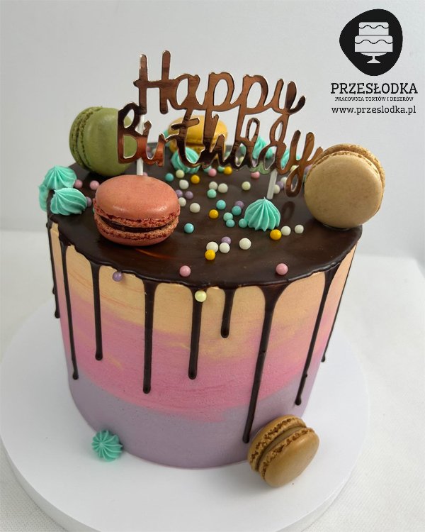 Bardzo ładny, kolorowy tort ozdobiony makaronikami oraz czekoladową polewą na górze z topperem Happy Birthday. Torty Piaseczno, Warszawa.
