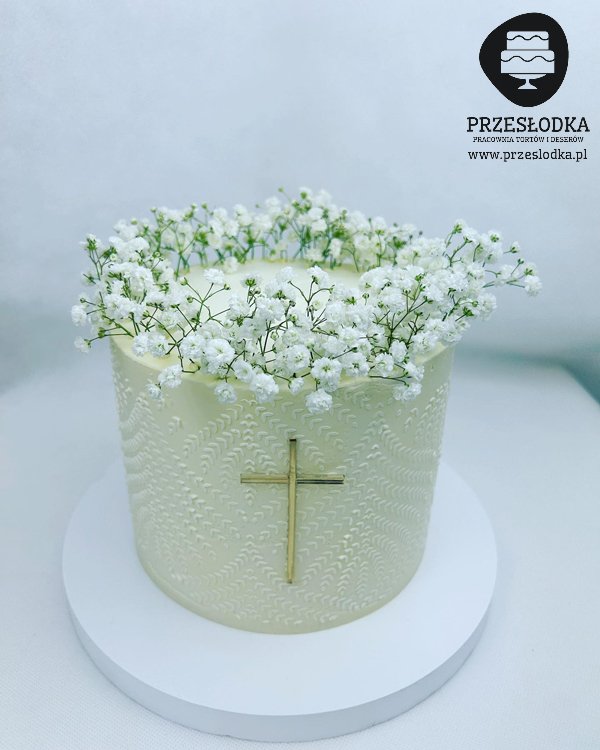 Prosty i elegancki tort na Komunię Świętą z krzyżem i delikatnymi zdobieniami wraz z kwiatkami.
