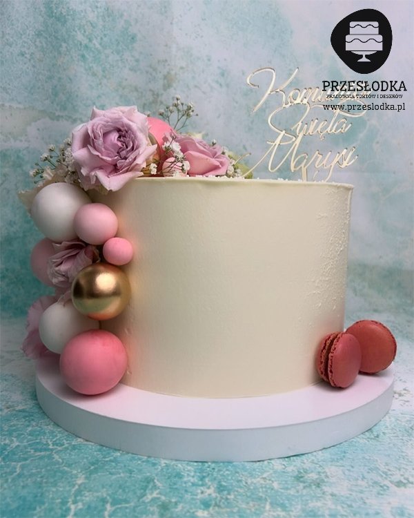 Tort na Pierwszą Komunię Świętą przyozdobiony kulami w różnych kolorach, naturalnymi kwiatami oraz eleganckim topperem. Torty Piaseczno, Warszawa.