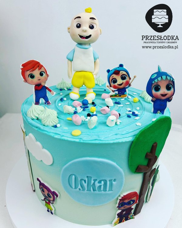 Tort z motywem z bajki Little Angel & Cocomelon z figurką chłopca.