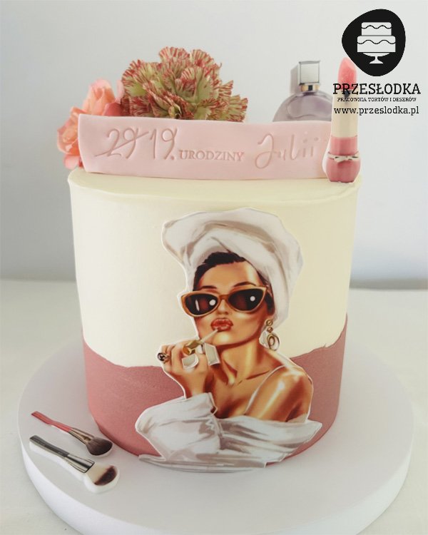 Tort dla makijażystki ze szminką, perfumami w kolorach kobiecych - torty Piaseczno, Warszawa.