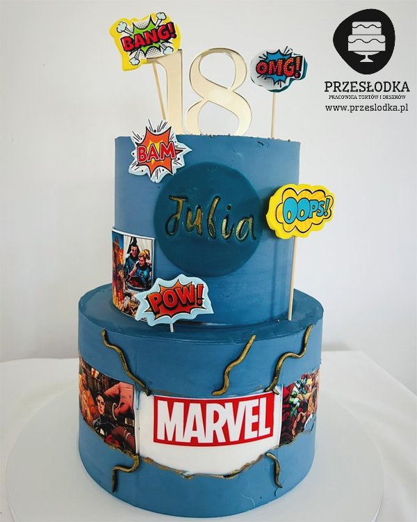 Tort dwupiętrowy w kolorze niebieskim z motywem Marvela - torty Piaseczno, Warszawa.