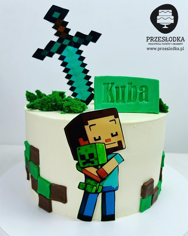 Tort dla miłośnika gry Minecraft z wydrukami z masy cukrowej. Klockowy Świat bez ograniczeń! Torty Piaseczno, Warszawa.