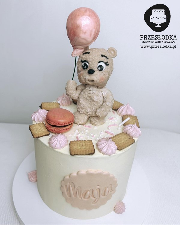Kremowy tort ozdobiony ręcznie robioną figurką misia trzymającego balonik. Torty Piaseczno, Warszawa.
