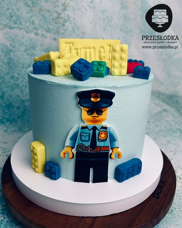 Tort z policjantem z Lego City. Dla miłośnika klocków lego. Torty Piaseczno, Warszawa.