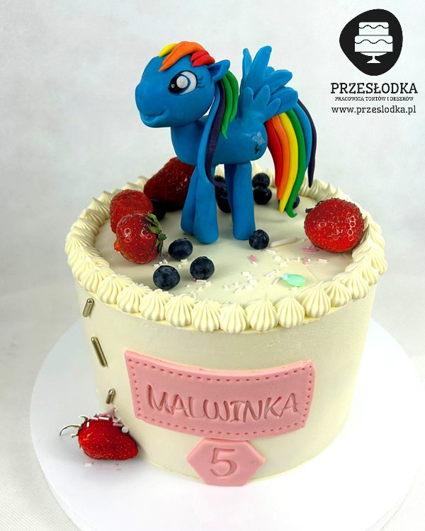 Tort z ręcznie lepioną jadalną figurką Rainbow Dash w otoczeniu świeżych owoców jagód i truskawek. Torty Piaseczno, Warszawa.