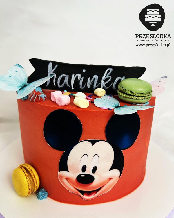 Pomarańczowy tort dla dziecka, który uwielbia filmy Disneya, a w szczególności przygody Myszki Mickey. Podobizna postaci na jadalnym wydruku, a na torcie ozdoby tj. niebieskie motylki, słodkie makaroniki, czy pianki. Torty Piaseczno, Warszawa.