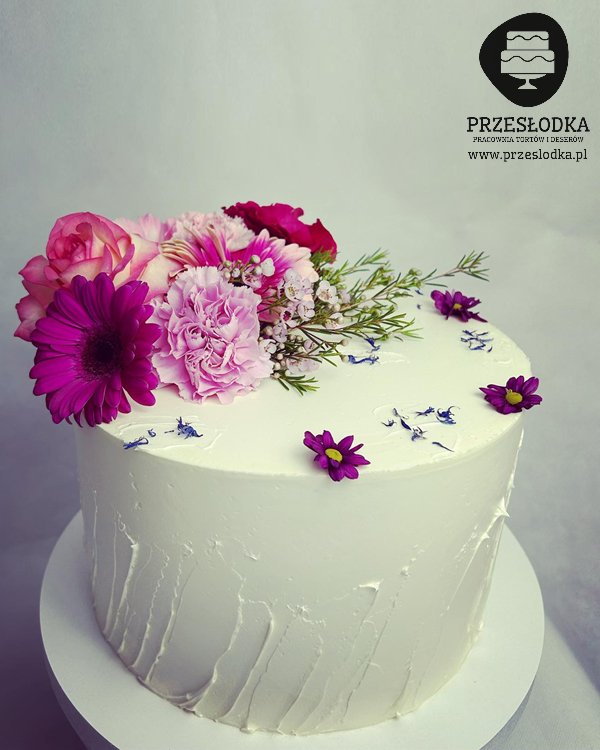 Tort na wesele dla pary młodej w kolorze białym ze zdobieniami z naturalnych kwiatów. Elegancki tort na tę jedyną chwilę w życiu. Torty Piaseczno, Warszawa.