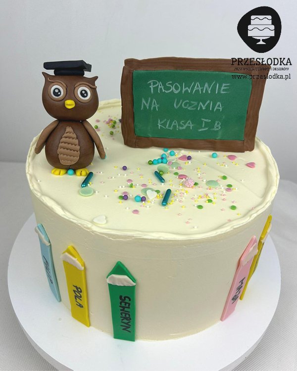 Piękny tort dla pierwszoklasistów z okazji pasowania na ucznia. Tort dla klasy 1b z ręcznie robioną figurką sowy oraz kredkami z imionami każdego dziecka z klasy. Torty Piaseczno, Warszawa.