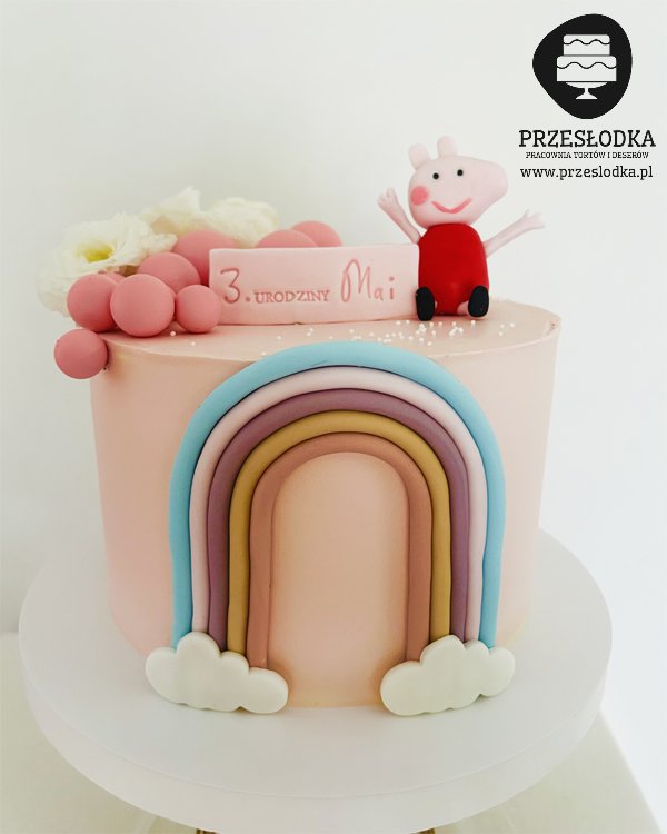 Tort z ręcznie robioną figurką Świnki Peppy oraz z tęczą - torty Piaseczno, Warszawa.