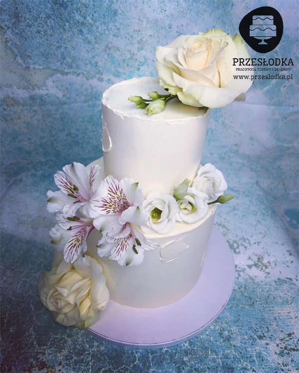 Tort weselny dwupiętrowy przyozdobiony trzema rodzajami kwiatów naturalnych w białym kolorze. Klasyczny i elegancki tort piętrowy. Torty Piaseczno, Warszawa.
