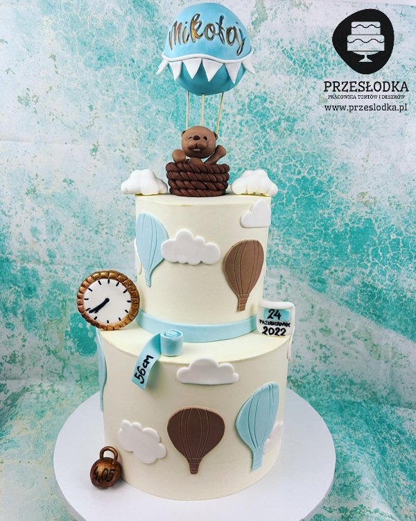 Tort z misiem w balonie, który leci w chmurach. Dodatkowe ozdoby to data i godzina urodzenia, waga oraz wzrost jubilata. Tort piętrowy na pierwsze urodziny. Torty Piaseczno, Warszawa.