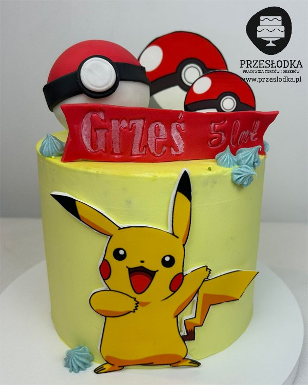 Żółty tort z wydrukowanym Pokemonem Pikachu, na górze kule PokeBall. PokeBall to przedmiot w kształcie kuli, służący do łapania Pokémonów i przechowywania ich, gdy nie są potrzebne. Torty Piaseczno, Warszawa.