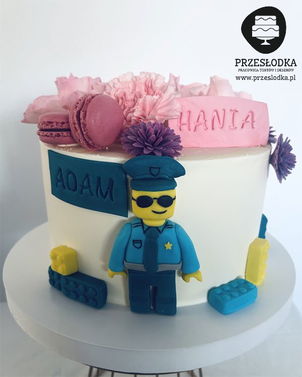 Tort dla rodzeństwa z motywem z klocków Lego i naturalnymi kwiatami. Jadalne klocki oraz ręcznie robiona figurka policjanta Lego - torty Piaseczno, Warszawa.