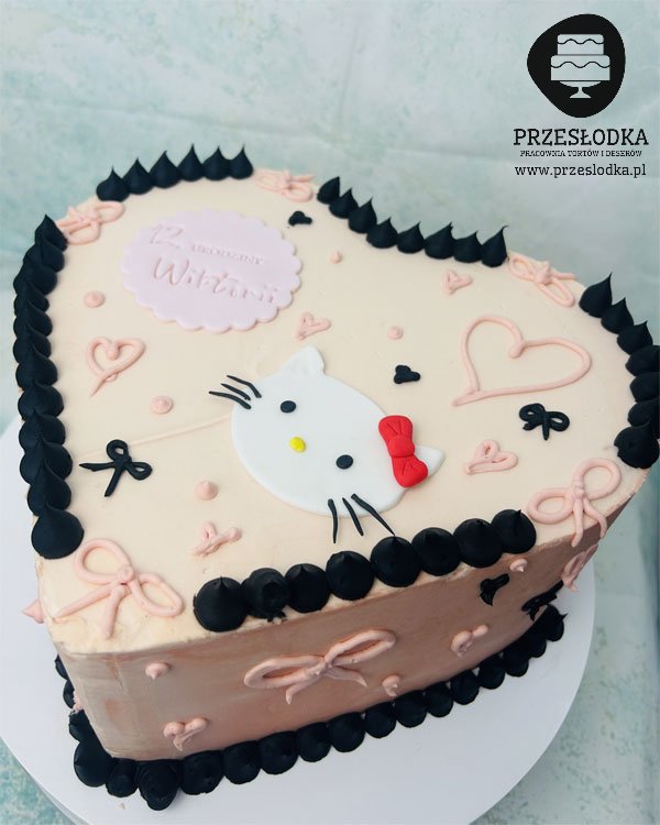 Tort w kształcie serca z motywem Hello Kitty - postacią wymyśloną przez Japończyków. Bohaterka filmów animowanych i gier komputerowych oraz ozdoba wielu gadżetów. Bardzo popularna w Japonii i Korei, gdzie powstał nawet samochód z jej wizerunkiem - torty Piaseczno, Warszawa.