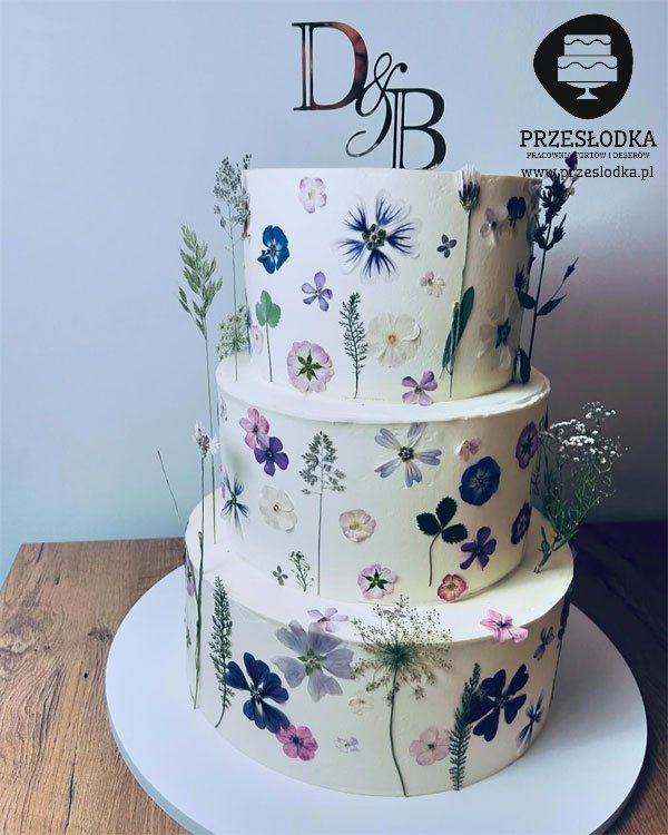 Tort piętrowy na ślub przyozdobiony suszonymi kwiatami - torty Piaseczno, Warszawa.