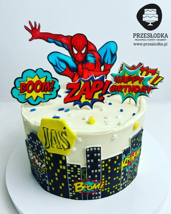 Poddany ogromnej dawce promieniowania i po ukąszeniu pająka młody chłopak odkrył, że nabył pajęcze zdolności m.in. chodzenie po ścianach, nadludzką siłę i zręczność, zmysł przewidywania zagrożenia. Tort dla każdego fana Spider-mana. Torty Piaseczno, Warszawa.