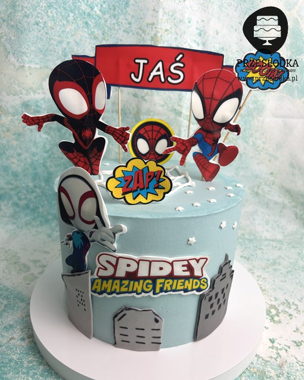 Tort dla fana bajki Spidey i super-kumple wydrukowanych na cukrowej masie jadalnej. Torty Piaseczno, Warszawa.