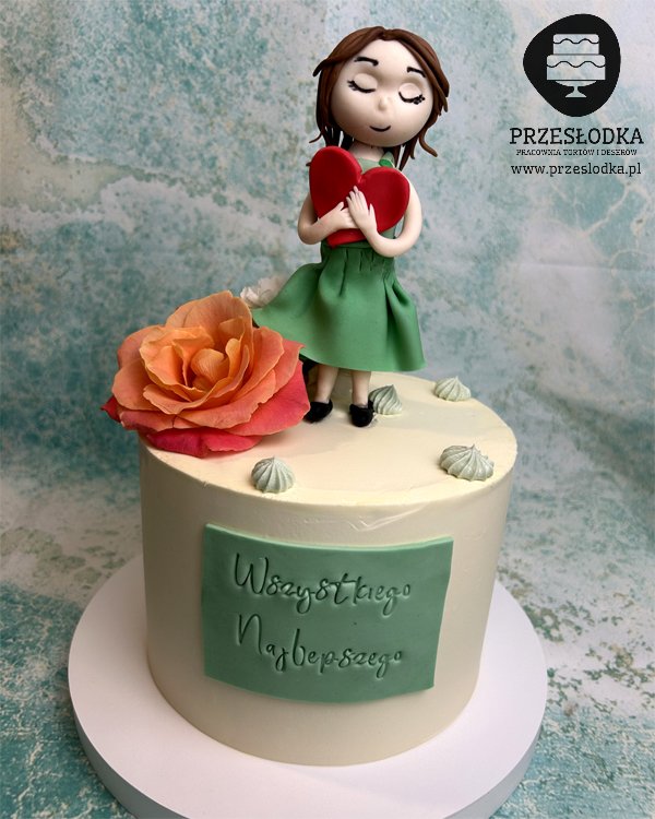 Tort z ręcznie robioną, jadalną figurką dziewczyny trzymającą serce i dodatkowo przyozdobiony kwiatami naturalnymi. Torty Piaseczno, Warszawa.