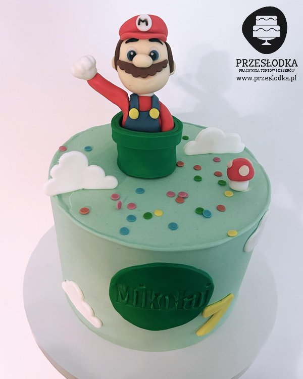 Super Mario to seria gier Nintendo, w której występuje ich maskotka, Mario. Teraz jadalna figurka Mario na torcie. Torty Piaseczno, Warszawa.