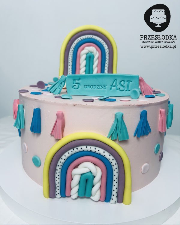Tort kolorowy z motywem bajkowej tęczy na piąte urodziny dziewczynki - torty Piaseczno, Warszawa.