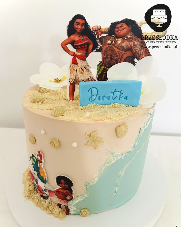 Tort z motywem z filmu Vaiana Skarb Oceanu. Vaiana jest córką wodza Tuiego i Siny. Jako dziecko została wybrana przez ocean, który wołał ją od najmłodszych lat. Rodzice dbają, aby trzymała się od niego z daleka, ponieważ chcą ją przed nim ochronić. Razem z Mauim ratują świat. Torty Piaseczno, Warszawa.