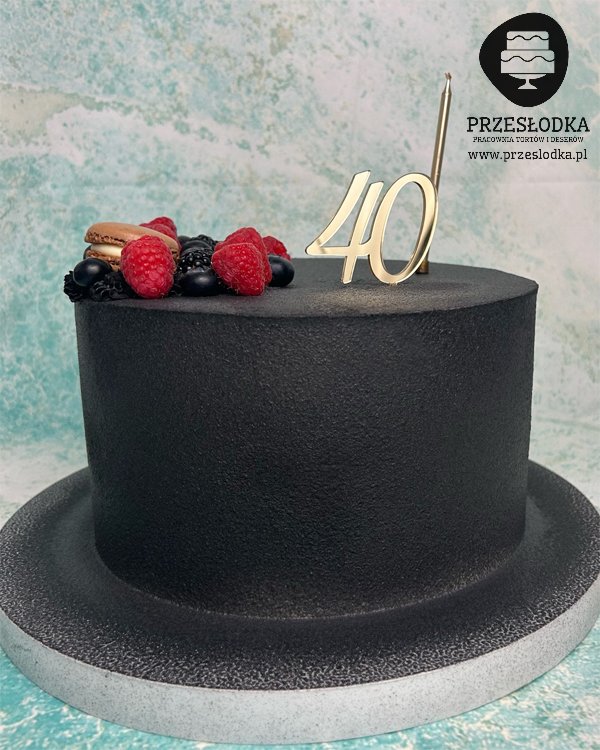 Minimalistyczny, elegancki tort męski w kolorze czarnym przyozdobiony owocami. Torty Piaseczno, Warszawa.