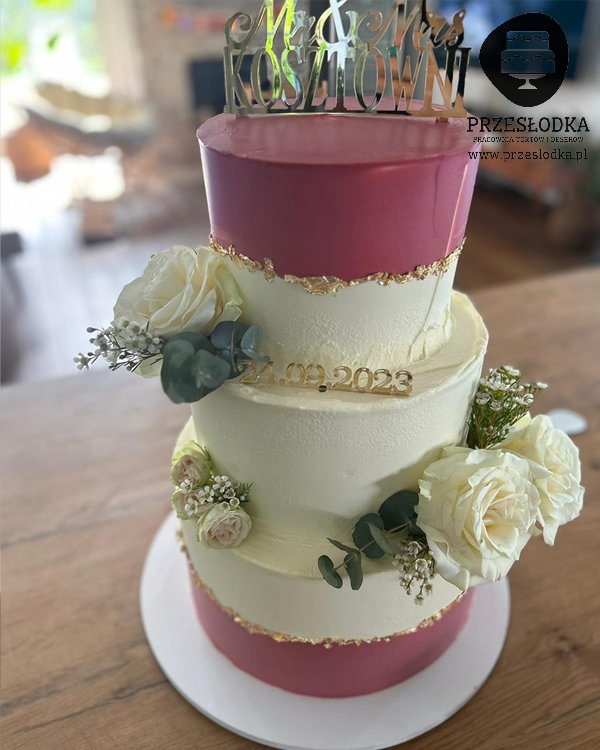 Trzypiętrowy tort na wesele w kolorach białym, różowym ze zdobieniami złotymi, dedykowanym topperem oraz naturalnymi kwiatami. Torty Piaseczno, Warszawa.