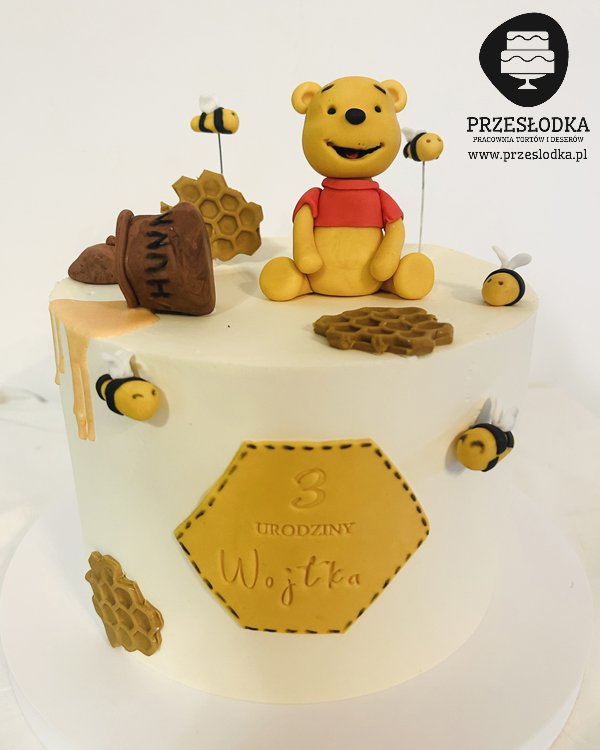 Tort z figurką ręcznie misia Kubusia Puchatka z miodzikiem - torty Piaseczno, Warszawa.