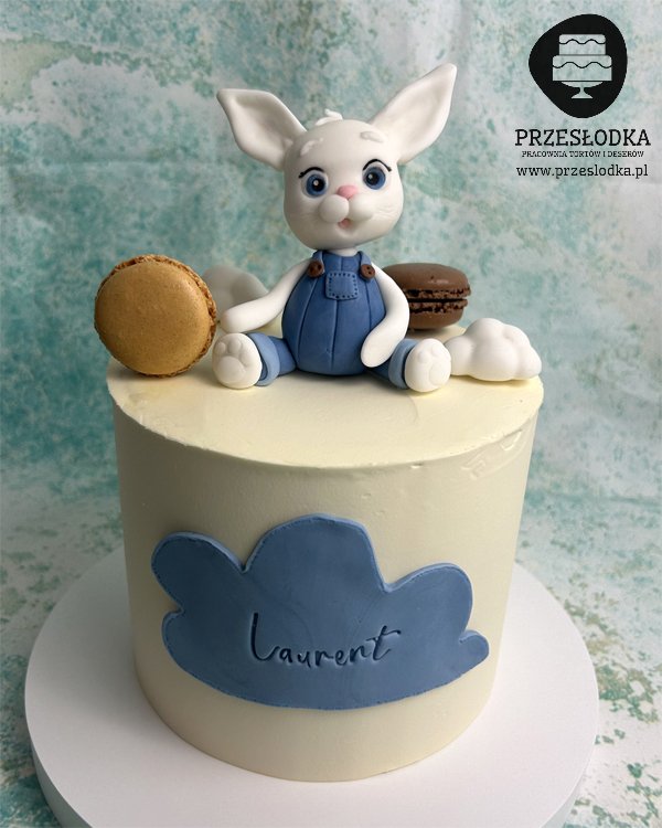 Tort z z ręcznie robioną figurką białego królika. W całości jadalna z masy cukrowej. Torty Piaseczno, Warszawa.