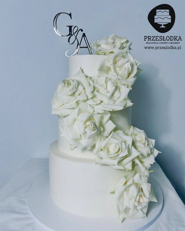 Tort na wesele piętrowy przyozdobiony białymi różami.