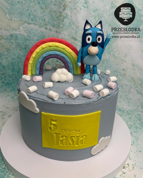 Niebieski tort z tęczą oraz ręcznie robioną figurką psa Bluey z rodzinnego serialu animowanego o perypetiach rodziny psów Bluey, jej siostry Bingo oraz rodziców. Torty Piaseczno, Warszawa.