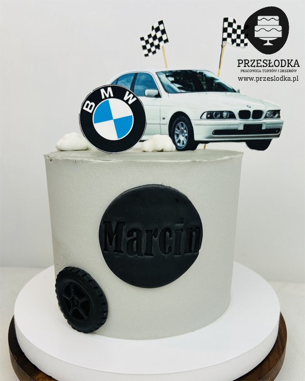 Tort z wydrukiem jadalnym białego samochodu marki BMW oraz flagami i znaczkiem koncernu. Tort dla fana BMW. Torty Piaseczno, Warszawa.